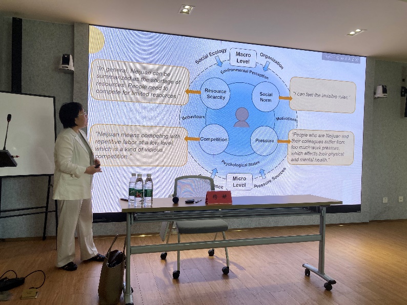 在讲座中,穆妍研究员首先让在场的师生填写了一份关于“内卷”的问卷,引导大家切身感受周围内卷环境的程度。接着,她系统介绍了国内外对“内卷”的定义,并和大家探讨了与“内卷”相关的关键词,其中“竞争”、“生活”、“内耗”、“浪费”等词语出现频率最高。穆妍研究员指出,人类在社会性和文化性属性下深陷“卷”的环境,并提出可以从压力、规范、竞争和资源稀缺等四个维度来衡量“内卷”的程度。此外,她还从文化角度深入剖析了 “内卷”现象与社会规范的紧密关系。在报告的最后,穆妍研究员结合最新的短剧和电影情节,提出了反内卷的生活态度,引发了与会者的深思。