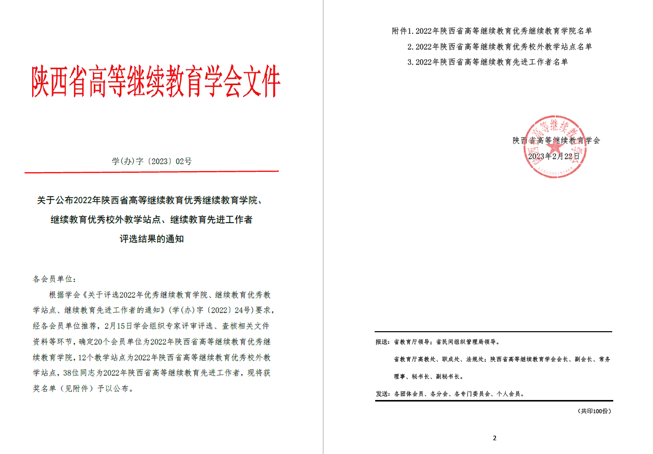 2023年2月23日,陕西省高等继续教育学会发布《关于公布2022年陕西省高等继续教育优秀Beat365唯一官方网站、继续教育优秀校外教学点、继续教育先进工作者评选结果的通知》,Beat365官网Beat365唯一官方网站荣获2022年陕西省高等继续教育优秀学院,惠震获2022年陕西省高等继续教育先进工作者。