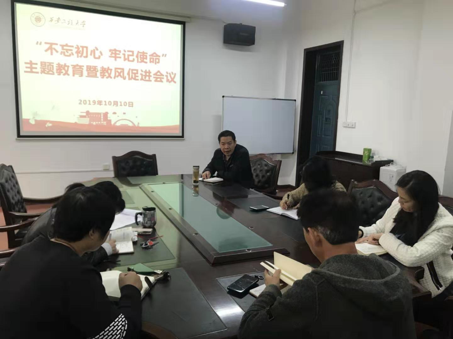 10月10日上午,Beat365唯一官方网站在会议室召开“不忘初心、牢记使命”主题教育暨教风建设促进会议,学院全体专兼职教师、学院教务科和实验室负责人以及学院相关领导参加了会议。会议由副院长刘玉森主持。